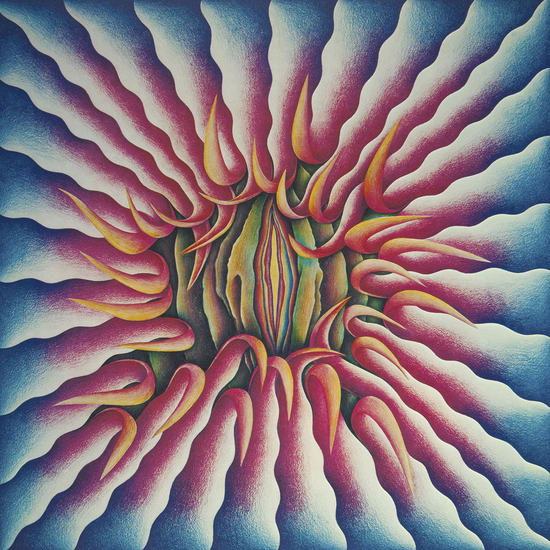 Chicago’s Flashback, Version 2 is the earliest print in Chicago in Ink: An Autobiography, and another print in the edition is owned by the Museum of Modern Art in New York. Despite being included in the influential 1965 exhibition “Primary Structures” at the Jewish Museum in New York, Chicago’s work in Minimalism remains underappreciated or dismissed as a lesser precursor to her feminist work. Yet her investigation of the economies of line and color were intrinsic to her later explorations of female and “central core” imagery. As queer-feminist art historian Jenni Sorkin has written of Chicago’s minimalist works, “Prior to developing the lexicon of vaginal or ‘core’ imagery that was to occupy her for most of the 1970s, Chicago’s content was about testing the limits of color through self-designed diagrams, systems and spatial patterning…Chicago’s production during the late 1960s and early 1970s represents a passionate and original pursuit of the experiential nature of color, transformation, and visual perception.”