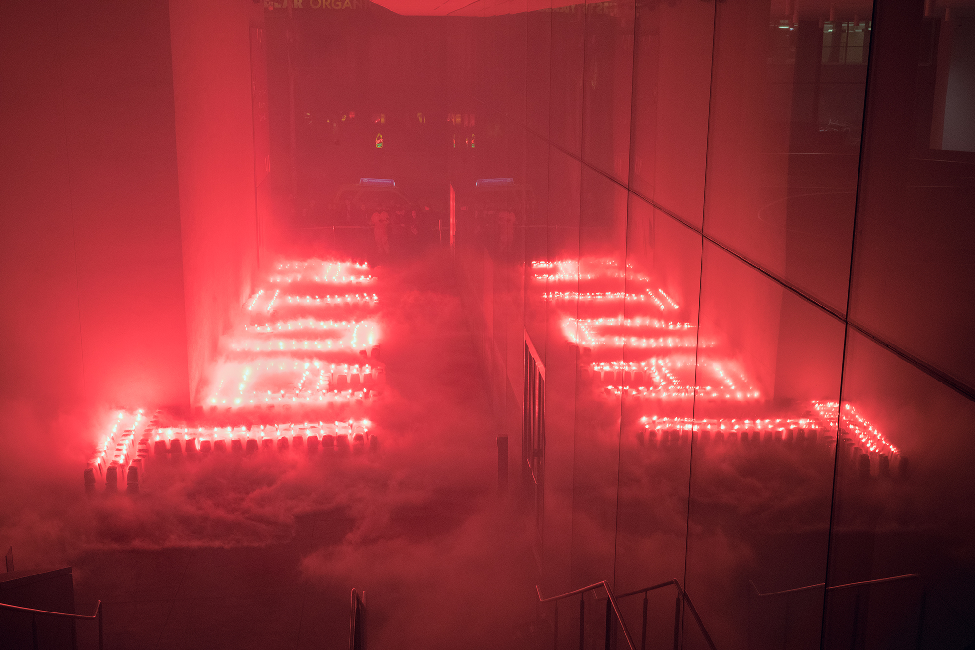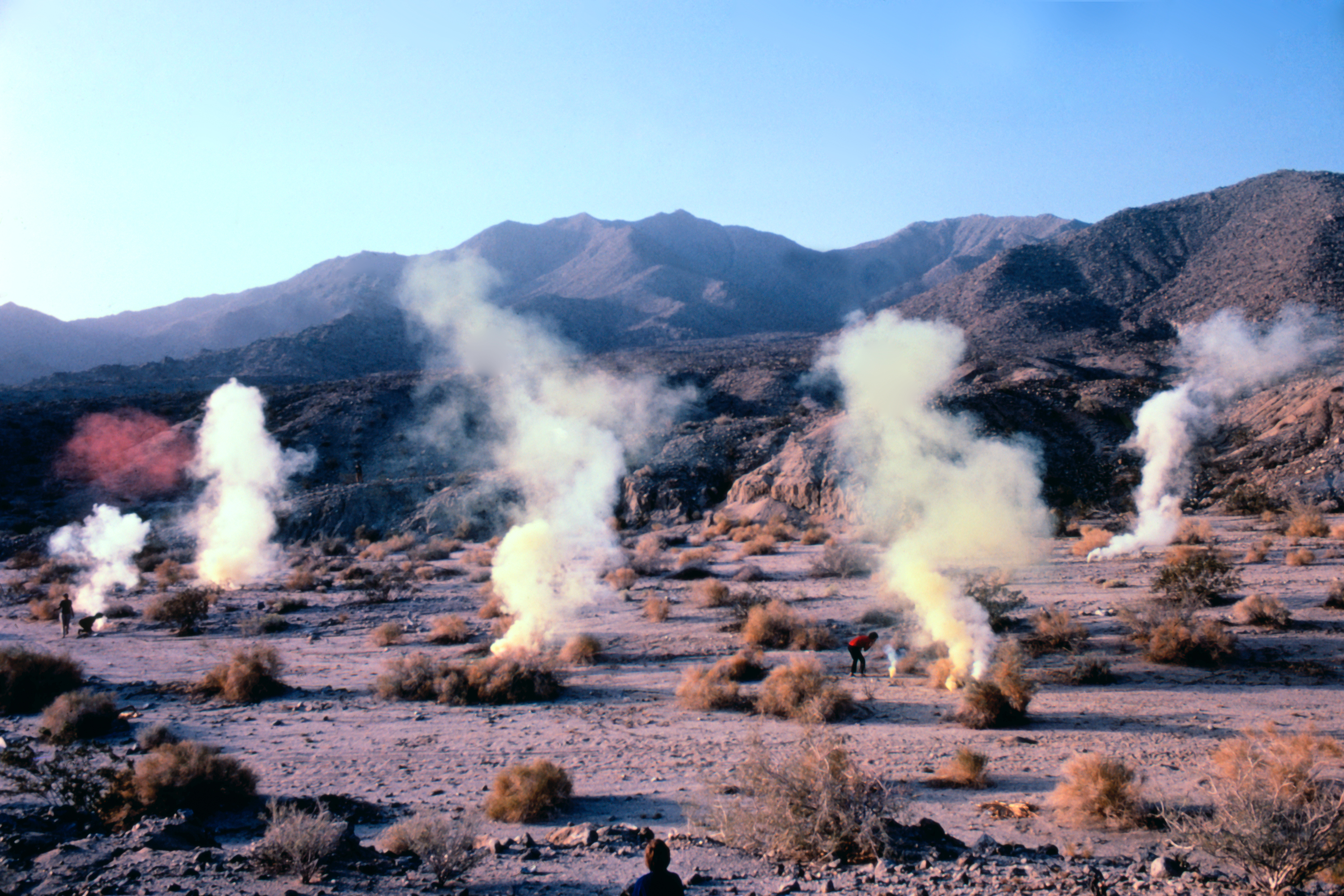 Chicago began using pyrotechnics in the late 1960s in order to feminize the atmosphere and the land, which, in Southern California, were dominated by boys and the hard, slick lines of their cars. From overpasses to parking lots and the deserts outside Los Angeles, Chicago brought colorful smoke, often emitting from empowered nude female bodies, to the harsh and masculinist landscape. Chicago continues to use multichromatic flares and fireworks for increasingly large-scale commissions, such as A Butterfly for Brooklyn (2015) in Prospect Park and A Purple Poem for Miami (2019). As Chicago writes in Through the Flower: My Struggle as a Woman Artist, her journey to learn about pyrotechnics were met with sexist violence and harassment, but the use of fireworks was nevertheless fulfilling artistically and personally, becoming a “release” for Chicago as she allowed the personal to manifest in her work.