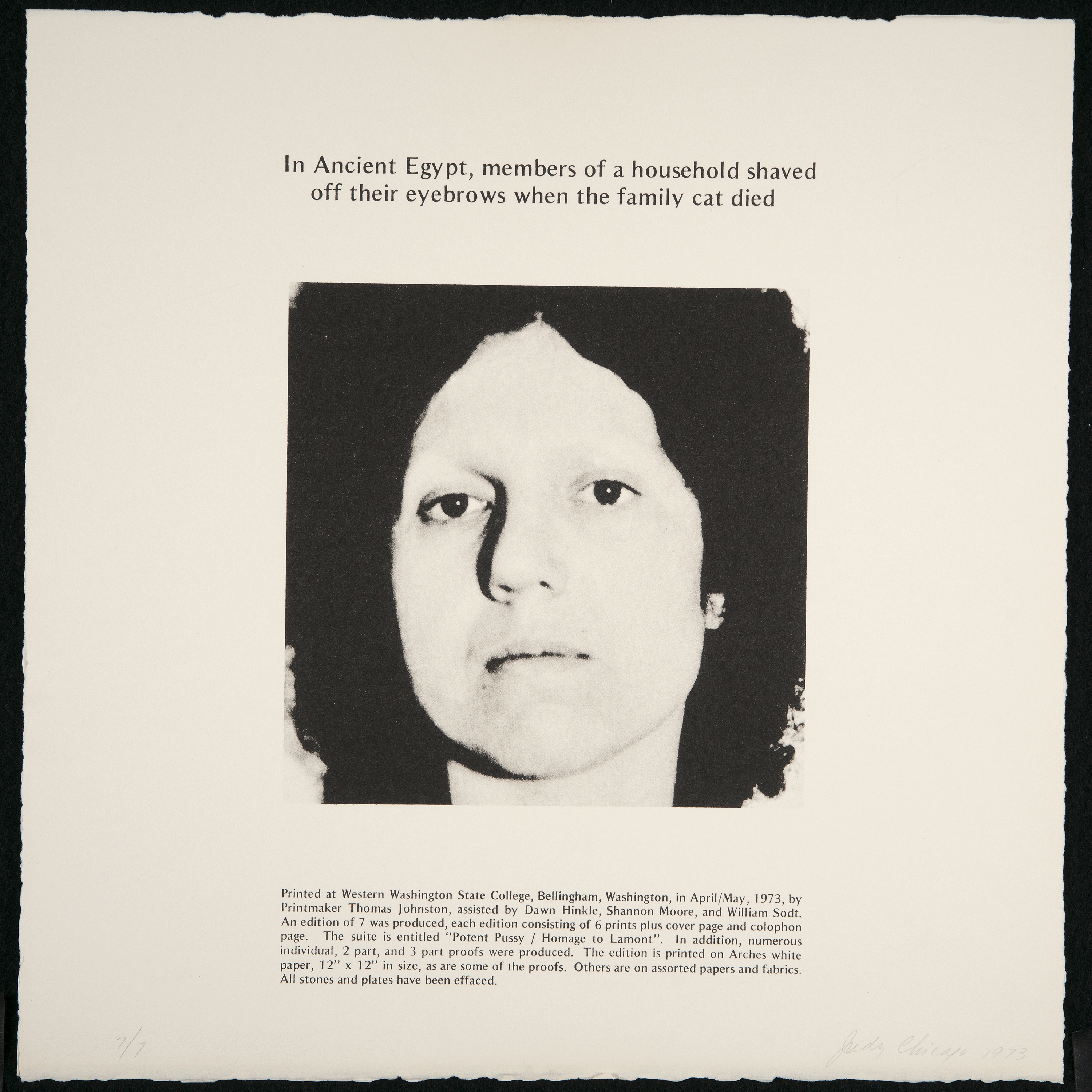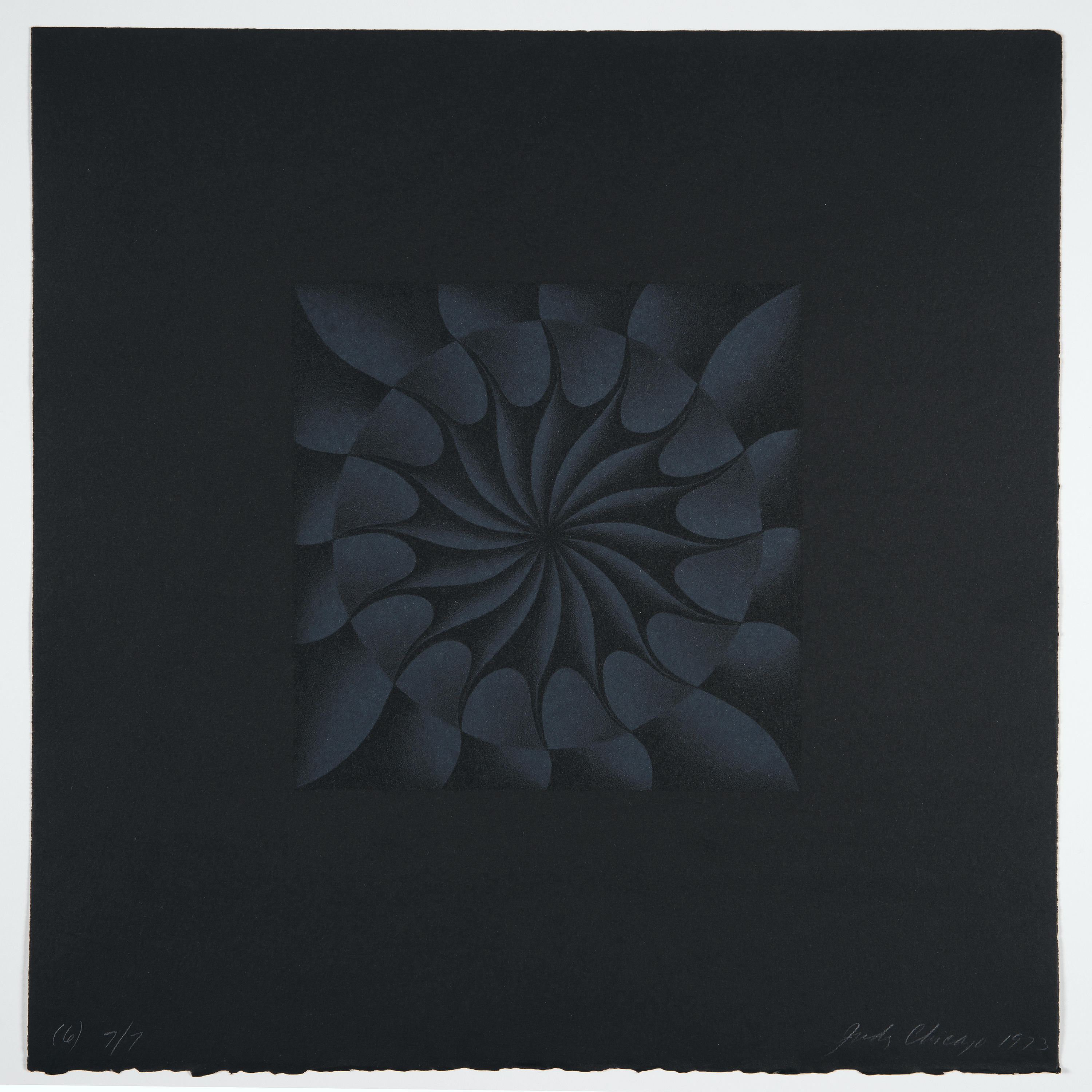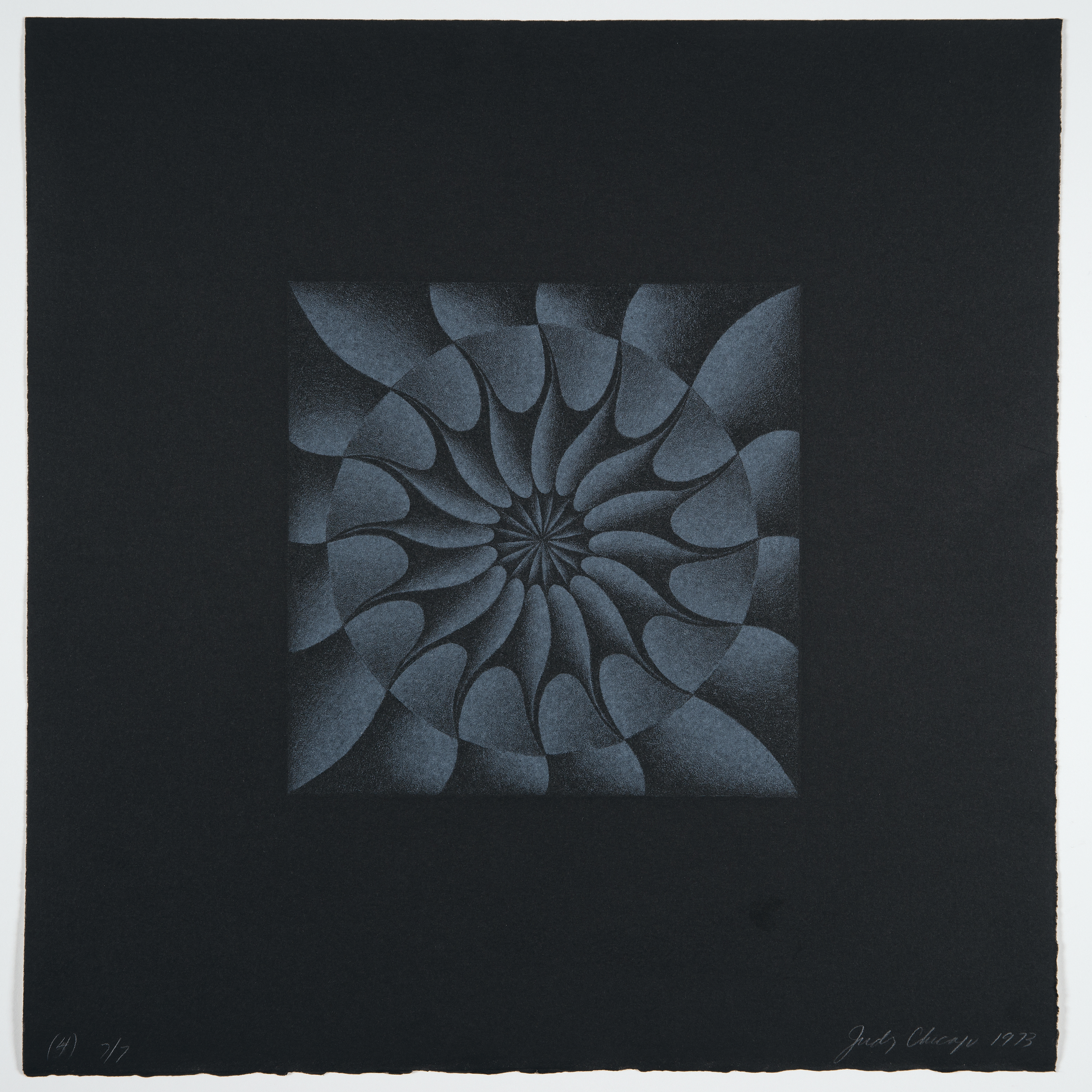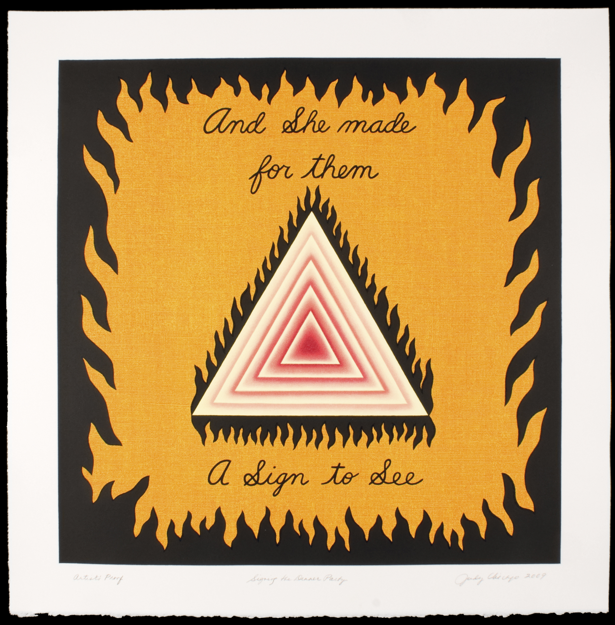 Men creating their own retrospectives is common in art history, most explicitly Marcel Duchamp’s de ou par Marcel Duchamp ou Rrose Sélavy (La Boîte-en-valise) (1936)—a box containing reproductions of his most famous works. Chicago has always been committed to empowering the self-archiving of women, so her Retrospective in a Box—a suite of ten prints surveying her career that contains, among other central series, the only limited edition print related to The Dinner Party—is, as always, a political gesture aimed at elevating women’s art and its preservation.